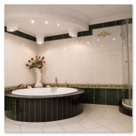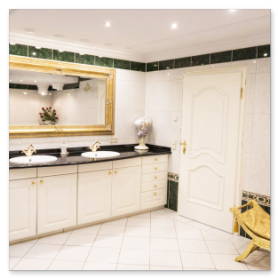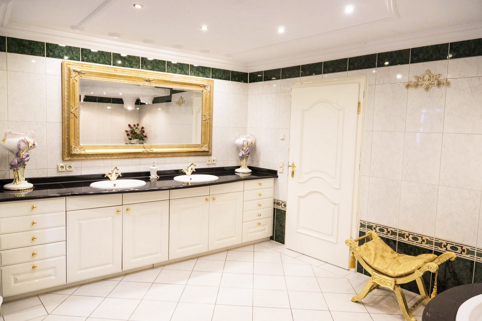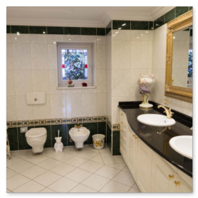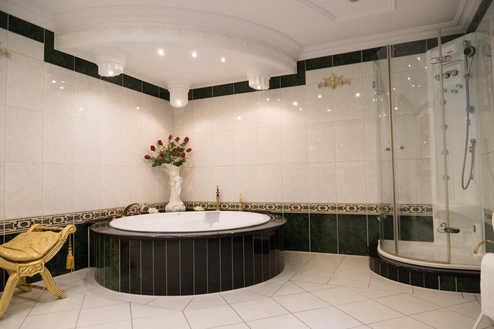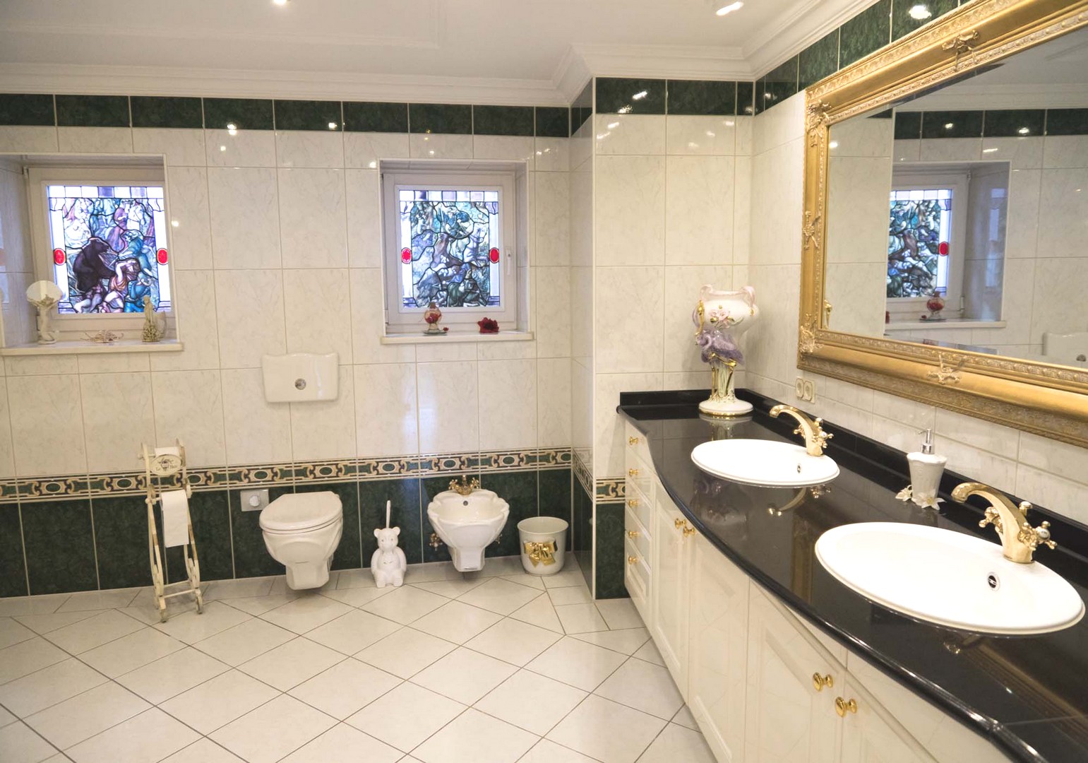 - Large bathroom "Cleopatra" with Egyptian tiles. The bathroom has a whirlpool for 2 people, double sink with granite pad, large mirror, shower temple, toilet, bidet, 2 leaded windows, valuable stucco work