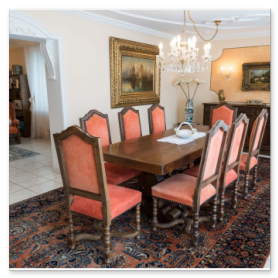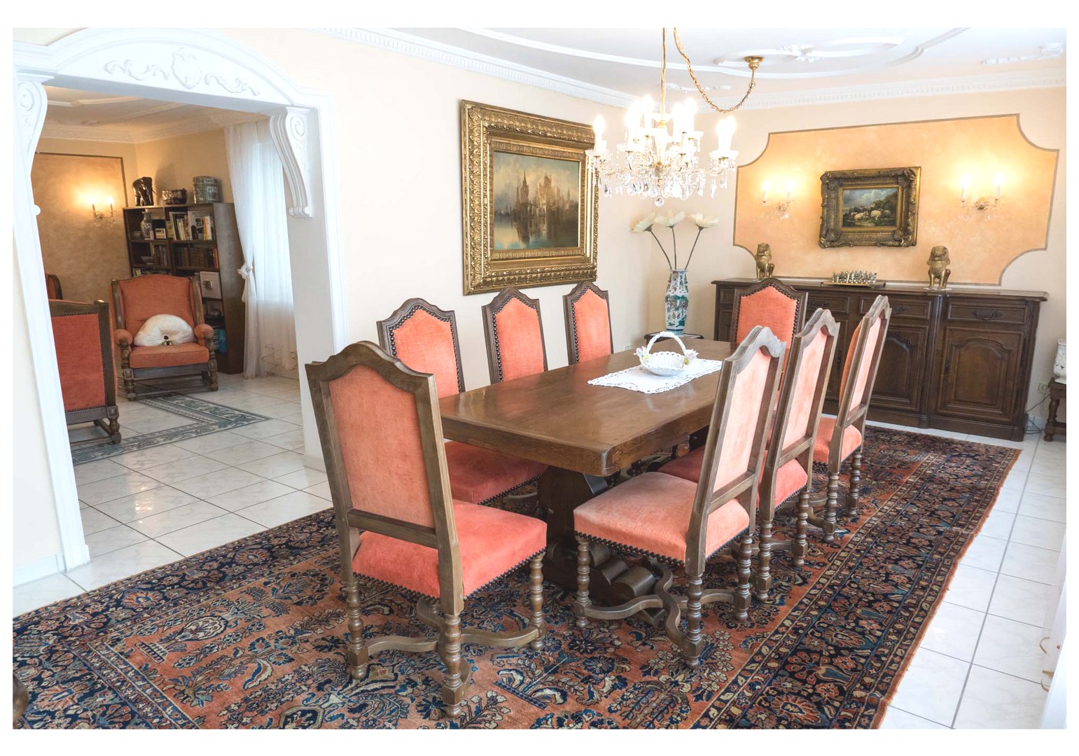 - Lounge with king table for 8 people, furniture in the style of King Louis XIII. from France, handcrafted in solid oak, crystal chandelier, large painting, large oriental rug,