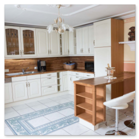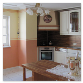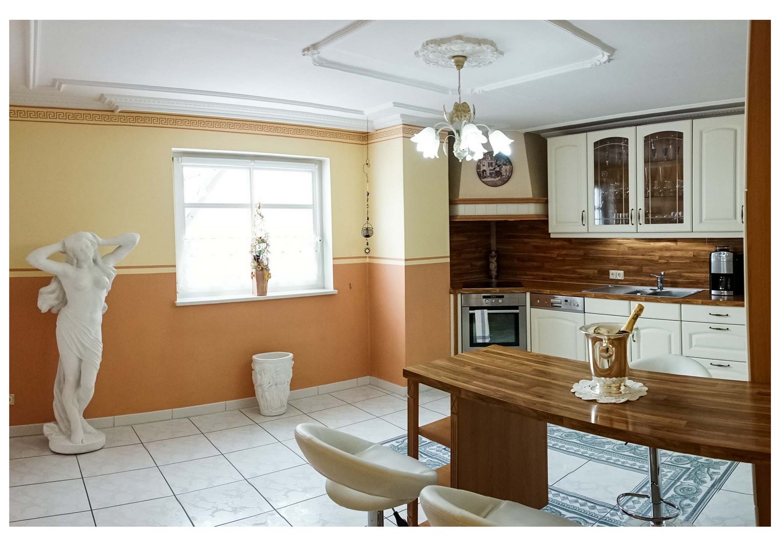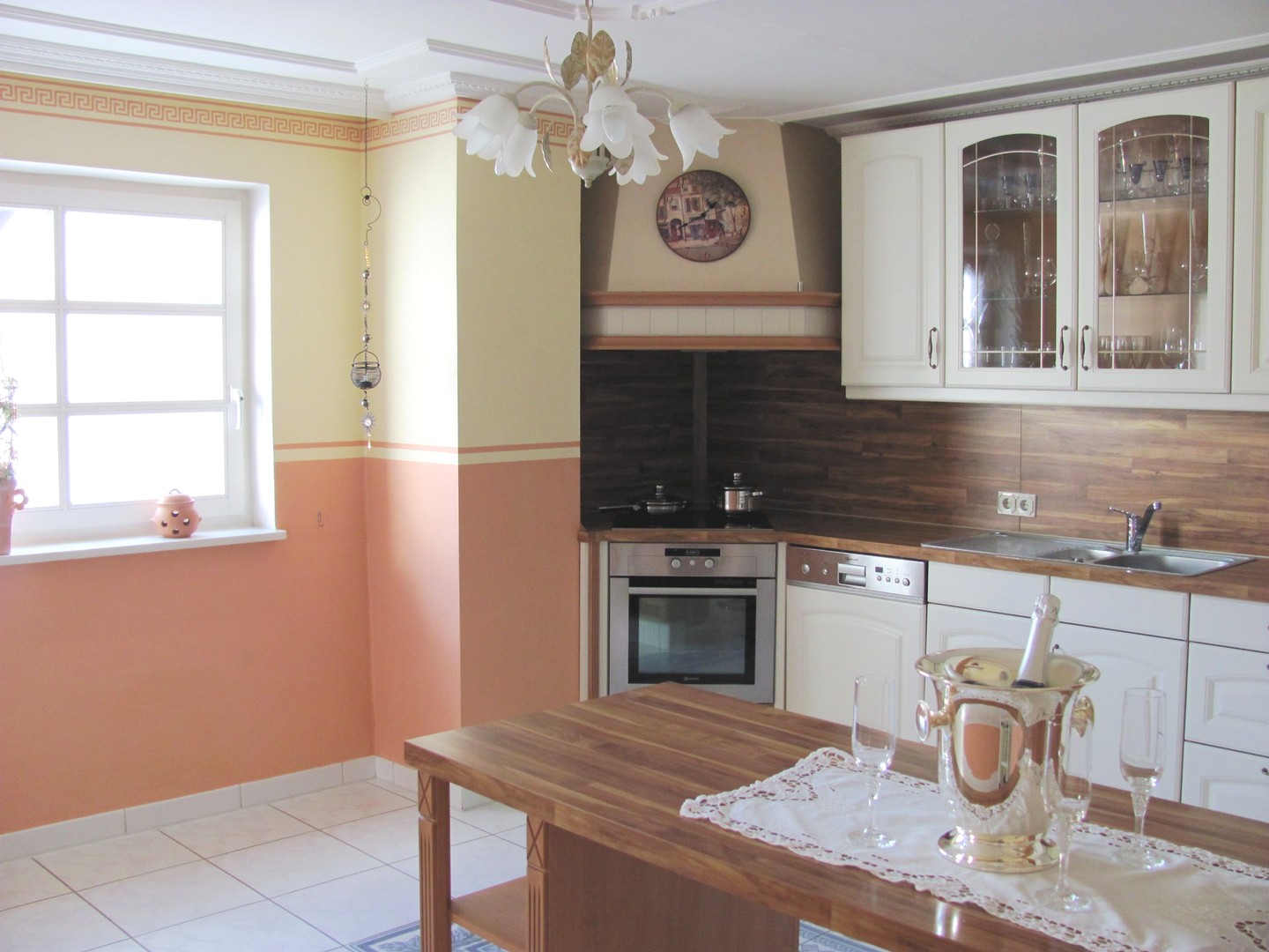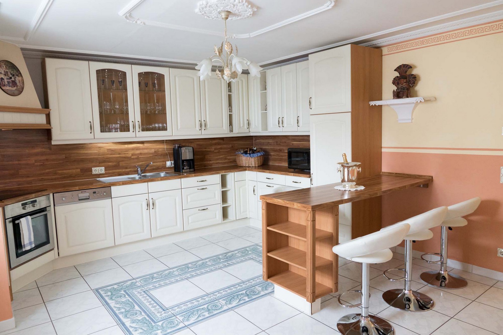 - Fitted kitchen "Toscana" in a country house style with a window, high quality equipment. Additionally with counter and 4 bar stools. Fully equipped, such as fridge freezer, stove, oven, dishwasher, porcelain crockery, glasses, cutlery, pots, coffee maker, kettle, etc.