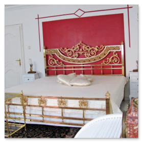 - Bedroom#1, Queen bedroom with real hard gold plated double bed 200x200, dressing table with stool, plus separate closet, crystal wall lights, silk rug