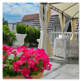 - 50 sqm SOUTH roof terrace with balustrade, double sun lounger 180x230 (in summer), seating area with stone table, 5-light lantern, amphorae, putti