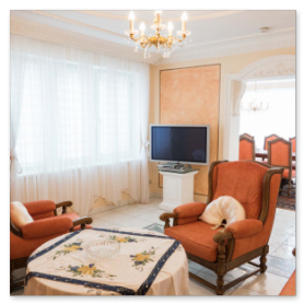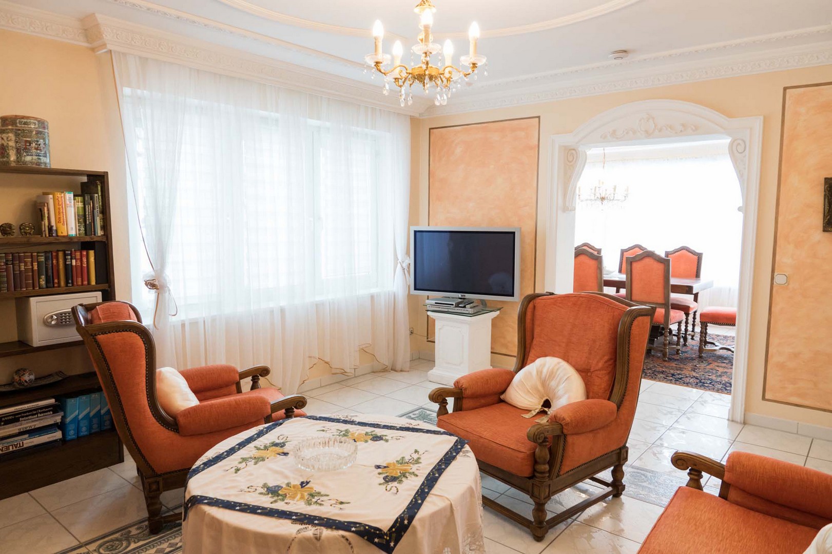 - Living room, flat screen TV, stereo with CD, furniture in the style of King Louis XIII. from France, handcrafted in solid oak. 7-seater sofa set, crystal chandelier, wall clock, various paintings